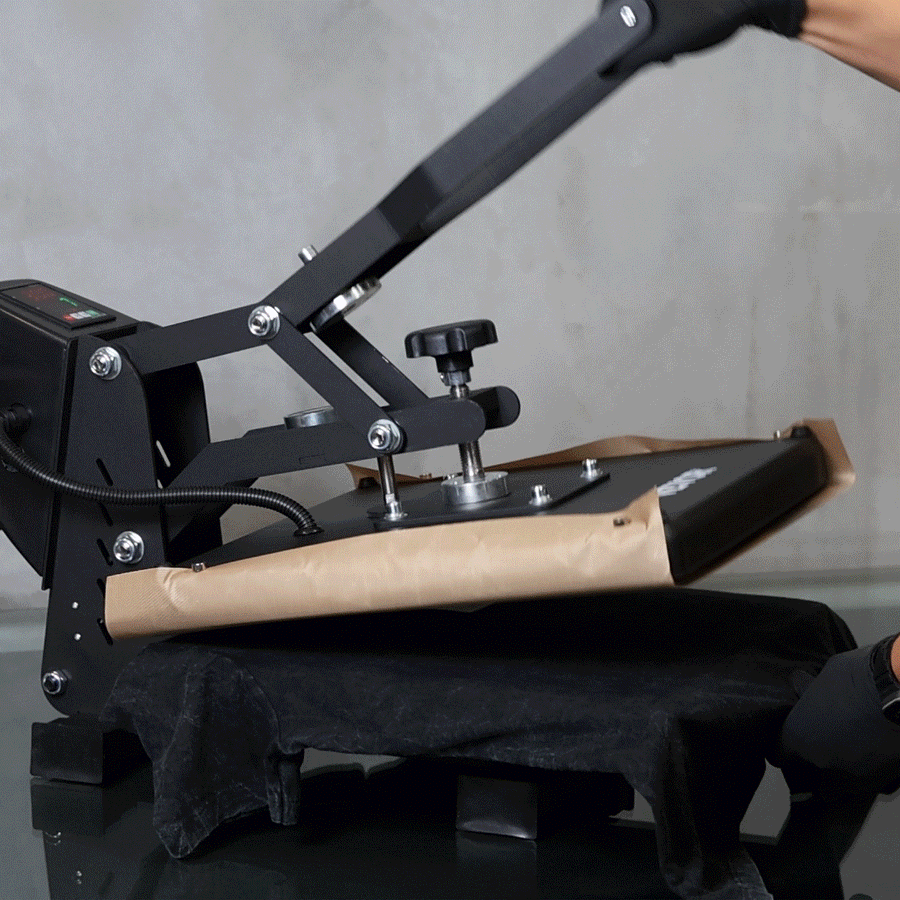 Just a heat press. A household iron doesn't provide consistent enough heat or pressure for a clean result. A basic 15×15 clamshell heat press is all you need — available for under $150.